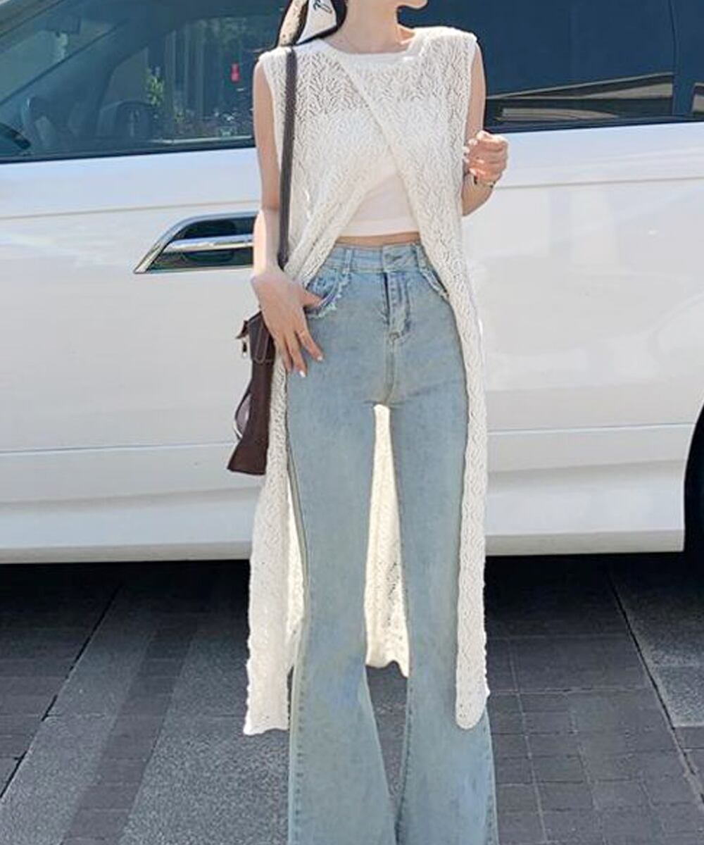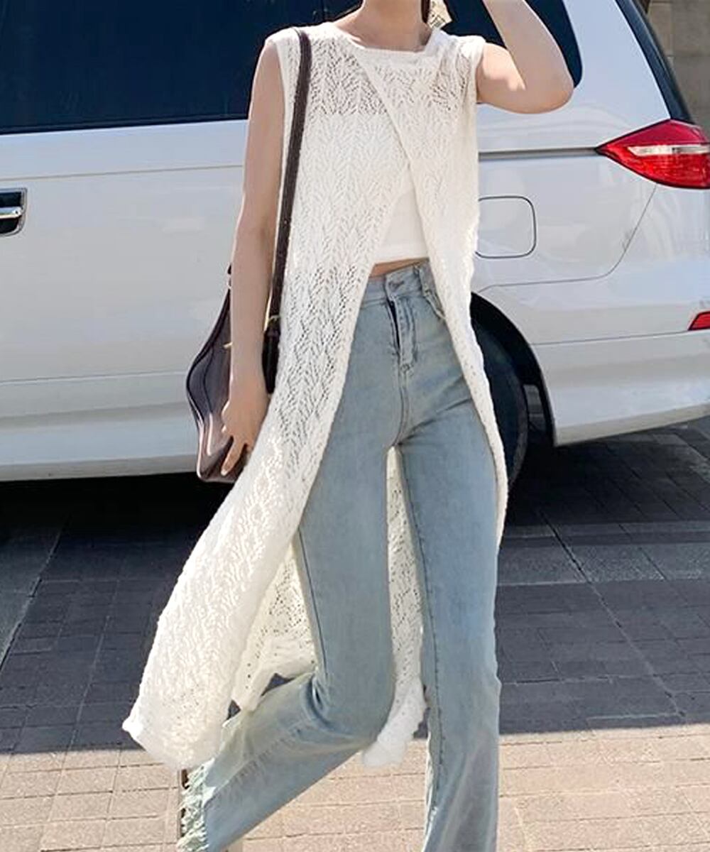 韓国風ロングベスト 透け感ゆるニット フェミニン 重ね着