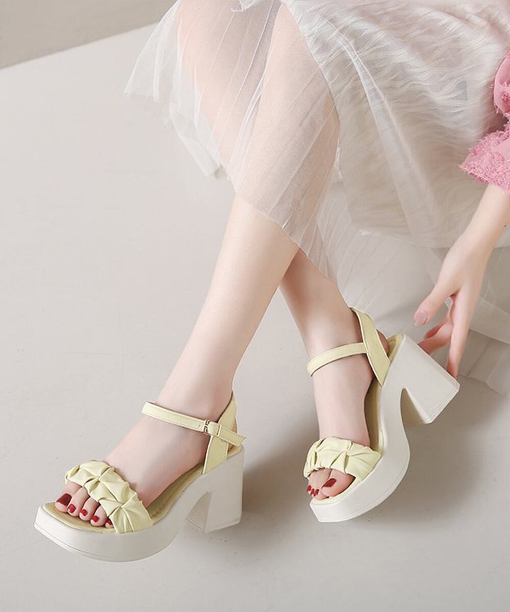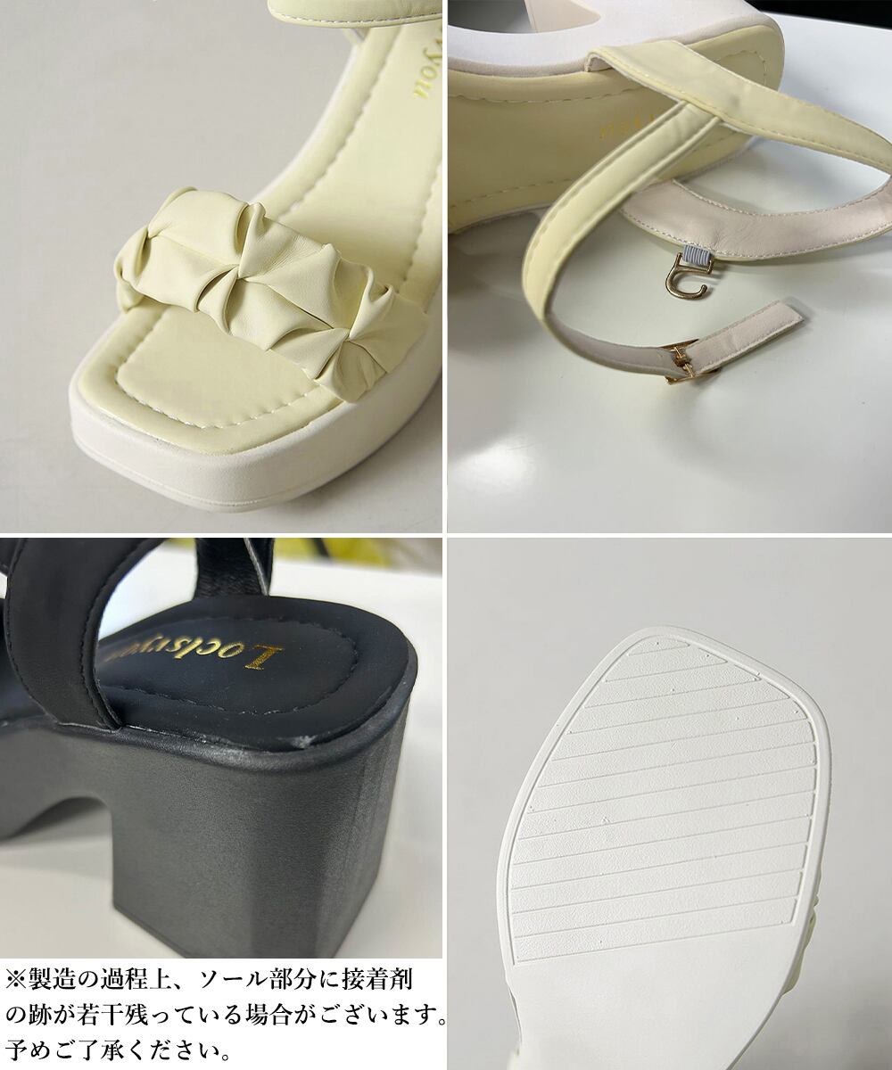 アッパーにはPUレザー素材を使用しており、ギャザーデザインがポイントのチャンキーヒールサンダル