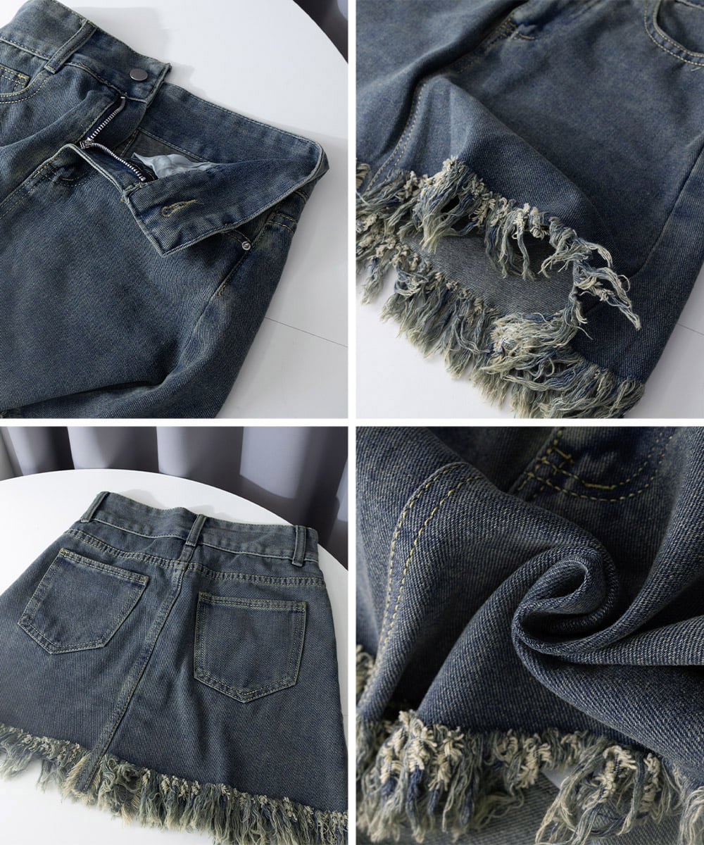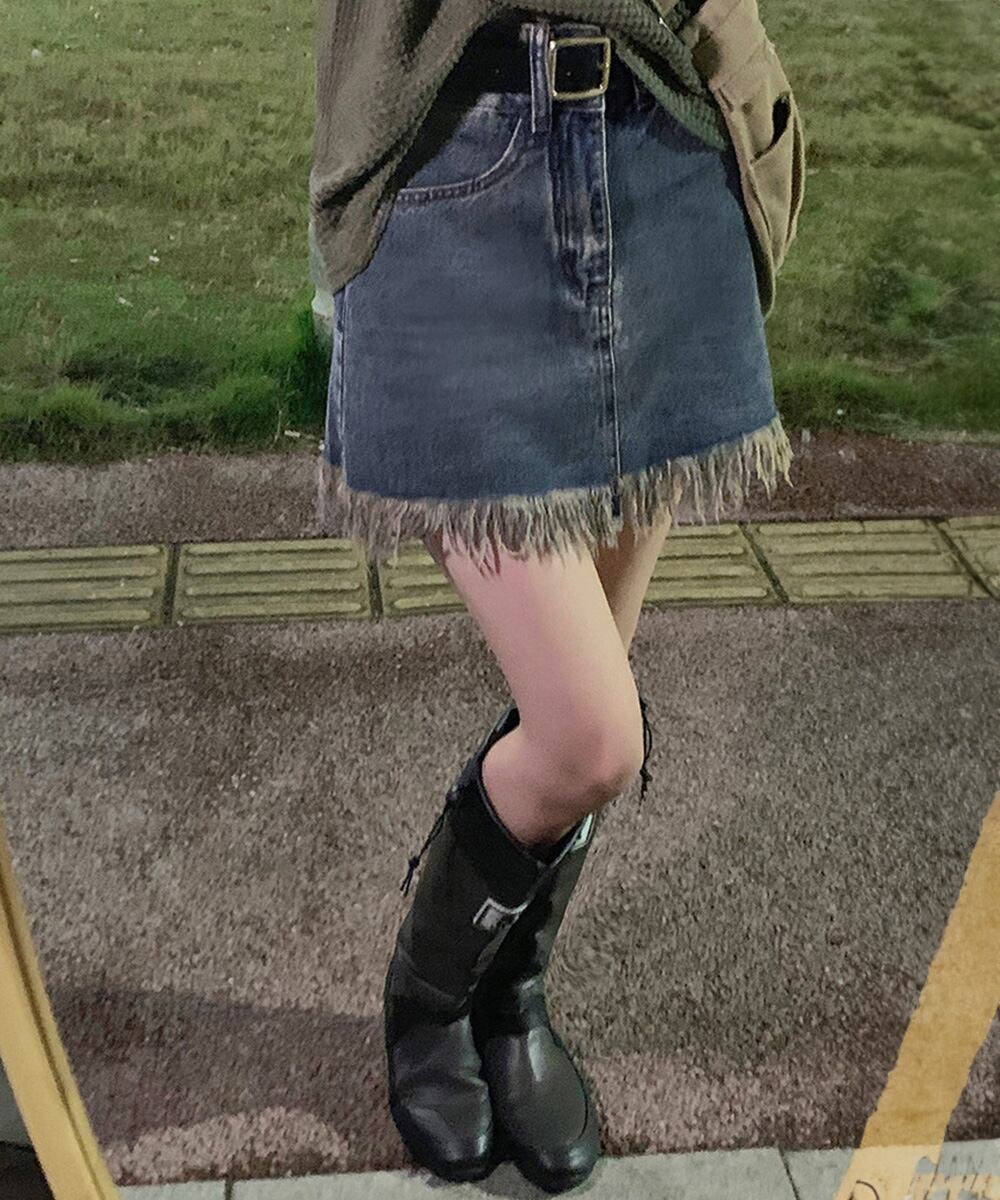 美脚効果抜群の裾フリンジデニムスカート!ハイウエストデザインで脚長効果も期待できる一枚。フリンジディテールが遊び心を演出し、お洒落度をグッと引き上げます。