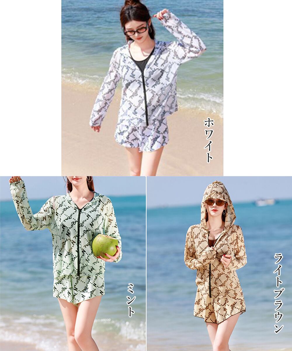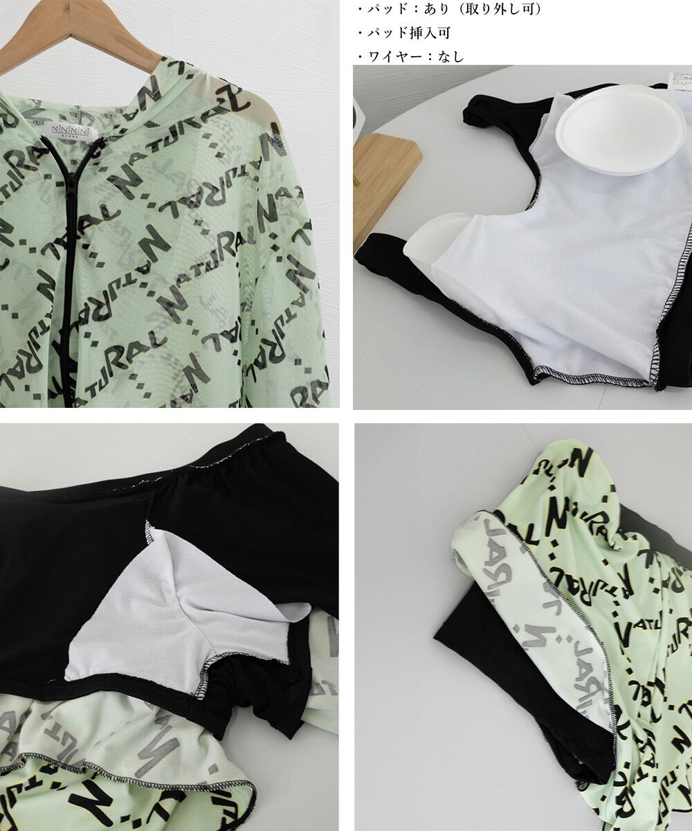 露出控えめ 水着3点セット 大人可愛い スイムウエア 英字柄 セパレート水着 日焼け防止 ラッシュガード付き 体型カバー